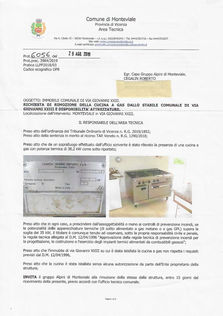 Raccomandata inviata dal Comune al Capogruppo Alpini il 05/09/2019